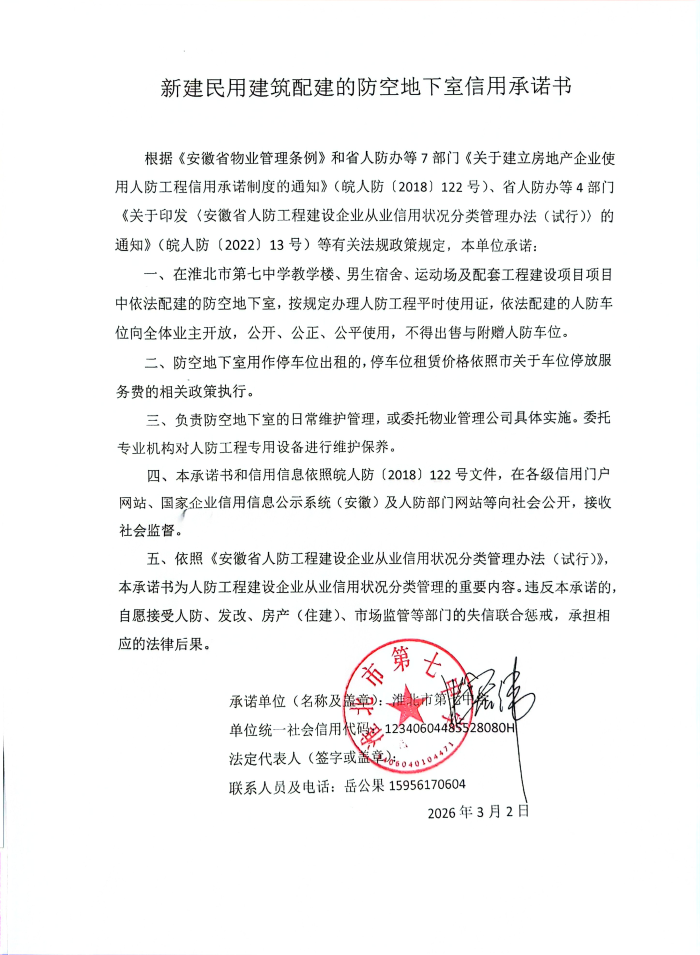 新建民用建筑配建的防空地下室信用承诺书(淮北七中)